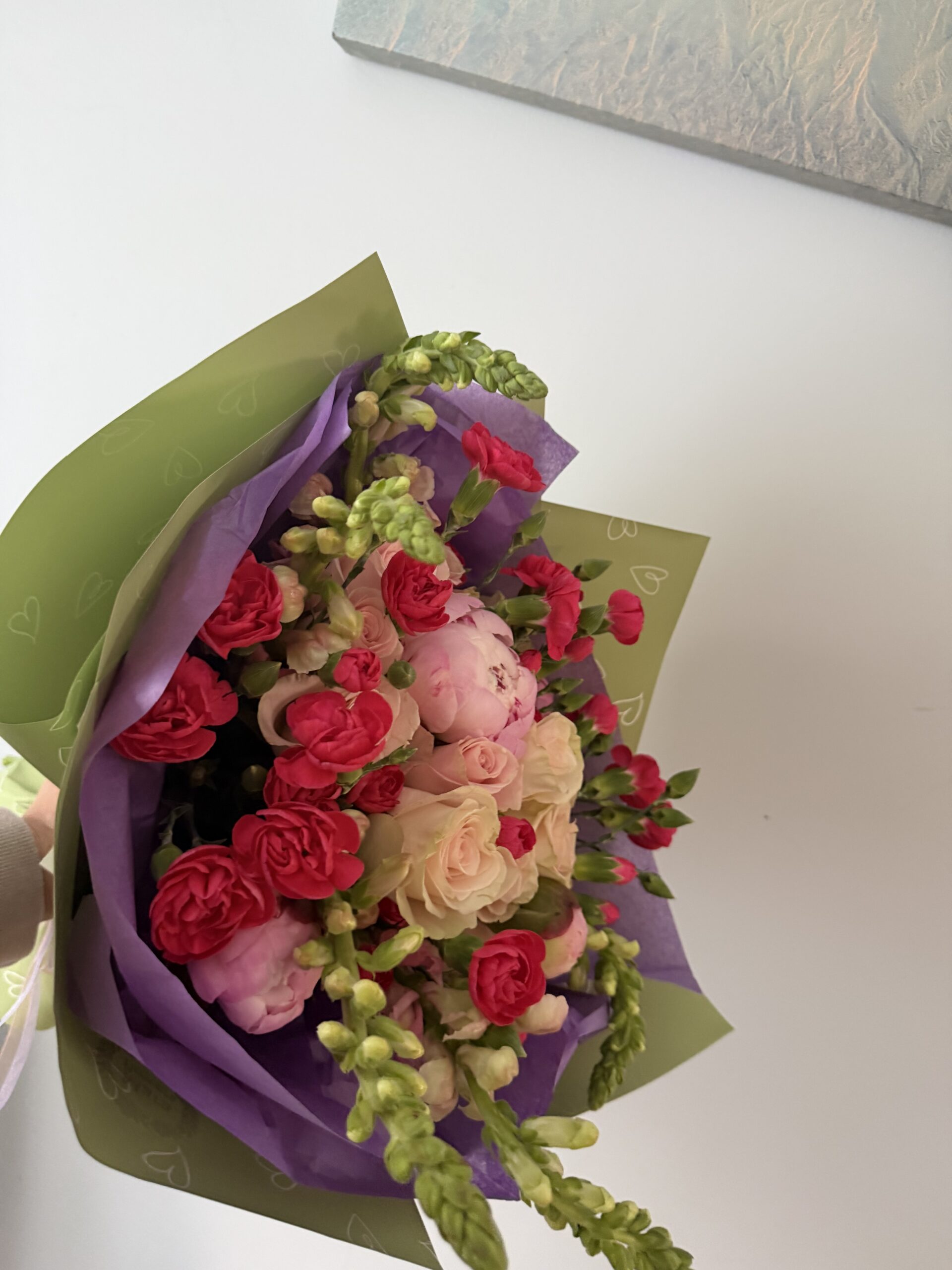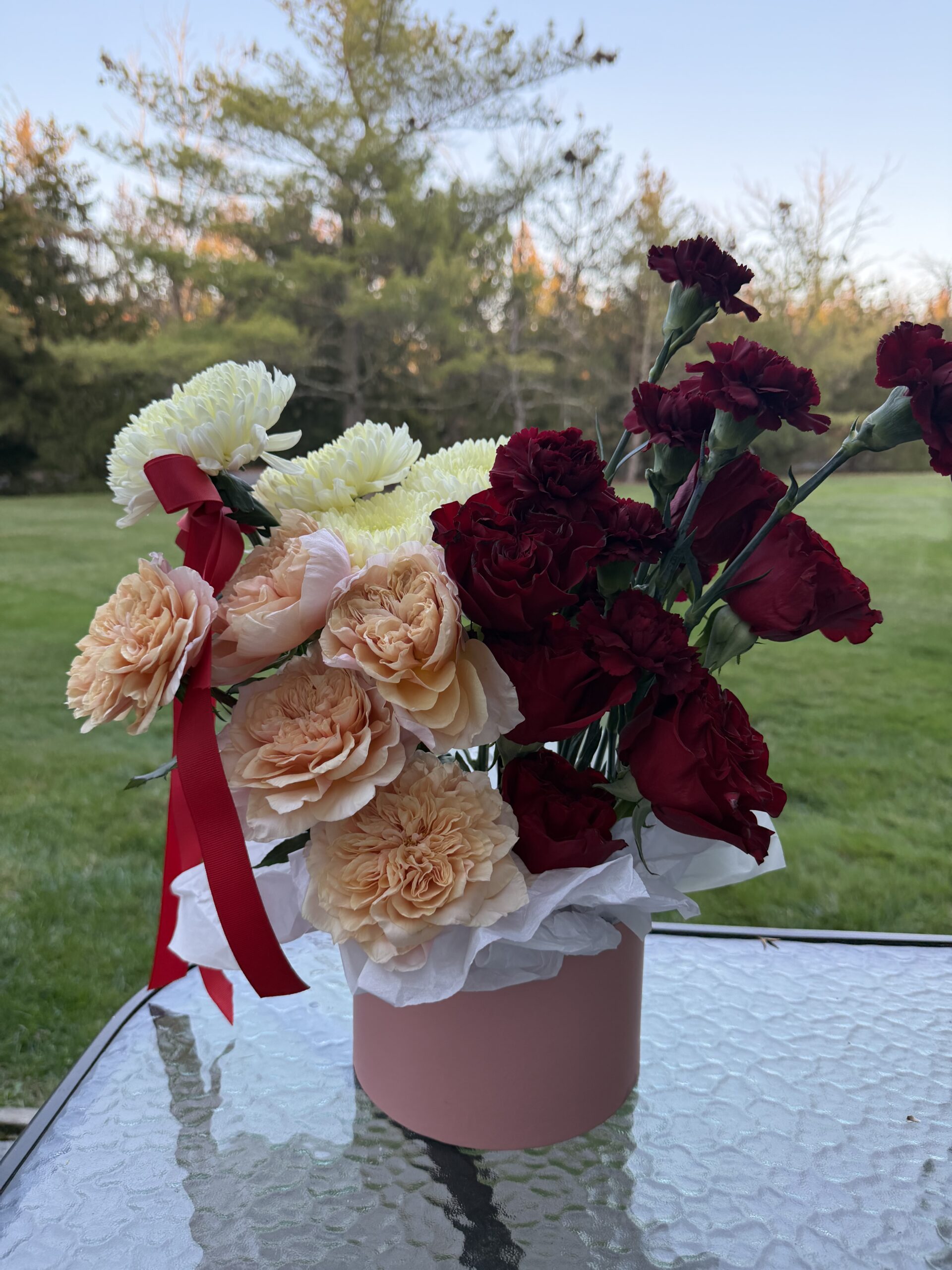 A red heart-shaped box filled with white roses, about 20-25 pieces. (You can choose a different color of roses if…